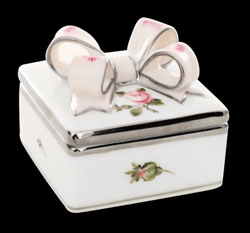 ■ヘレンド/ヴィエナローズ・プラチナ(VGR-PT)ピンクローズとつぼみの絵付け リボンスクエアボックス(6097-07)約6.5x6.5cm、高さ約5cm 特価¥47,850(税抜¥43,500)お取り寄せ |