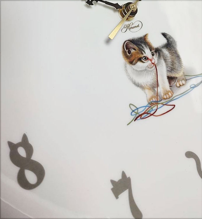 | ■ヘレンド/キャット/ウォールクロック箱入(7556SENF16)φ約28.5cm、壁掛けフック付き 糸で遊ぶ猫のモチーフ。時計の文字盤も猫のシルエットです。(秒針もついています) 特価¥77,000-(税抜¥70,000) 単3乾電池で動きます 壁掛けフック付き 市販の皿たてで立ててもOKです |