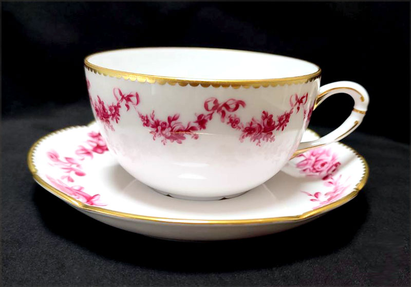 カップの特徴となっている背景のまだら模様のスタイルは、画家フランソワボードワン郷が前駆者です。薔薇などの花輪は、ルイ15世に好まれましたデザインです。オリジナルはブローニュ・スル・メール博物館にございます。製造中止 |