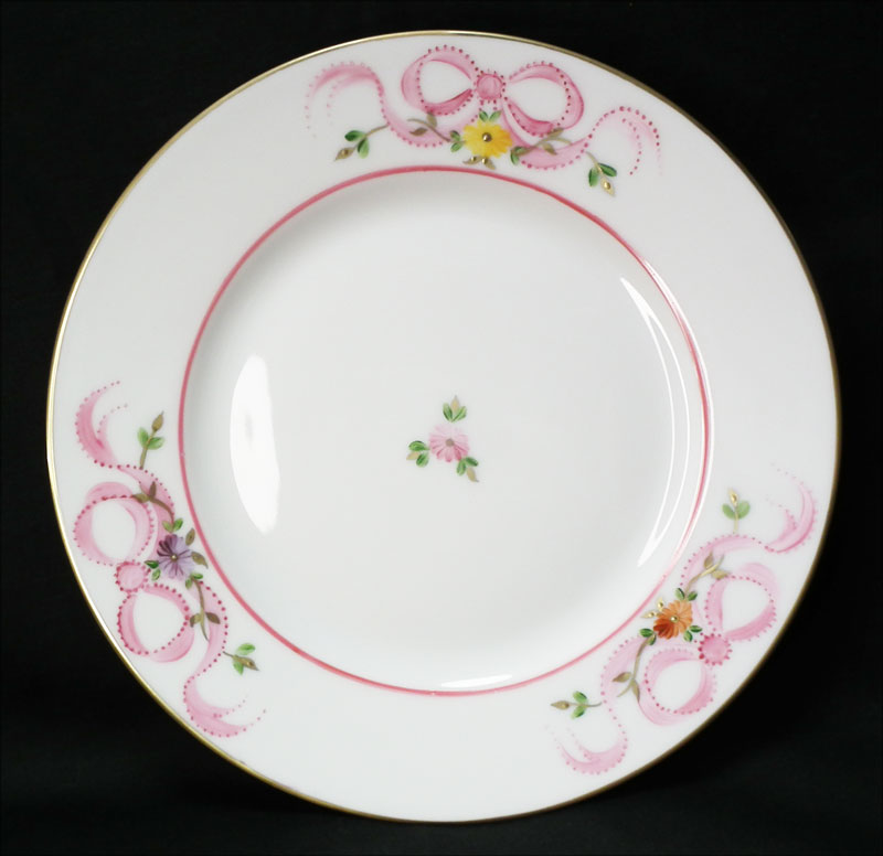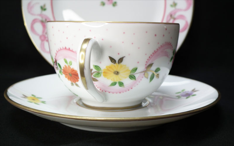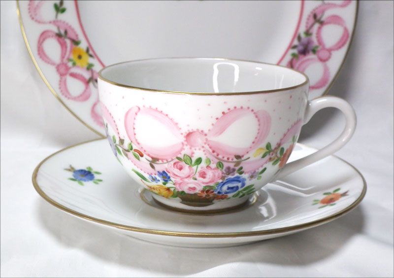 ピンクのリボンが可愛らしい、マリーアントワネットシリーズ、ピンクのラインがないシンプルな絵付けが発表されました。ハンドペイントですので、絵付けはひとつづつ違います。ゴールドは24金を使用。