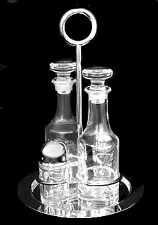■クリストフルシルバー/ヴェルティゴ 調味料入れ4本セット(箱入)3928-130 高さ約26cm、トレイφ約18cm、ソルト&ペッパーとボトルx2