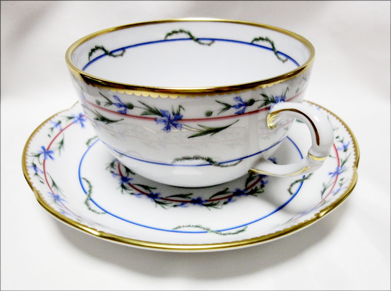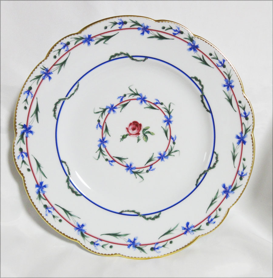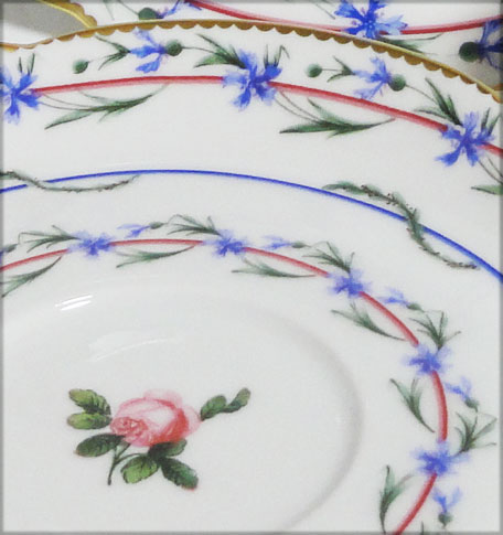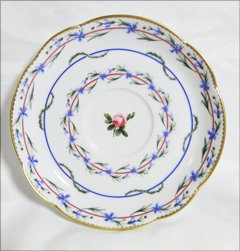 オリジナルは1782年セーブル工場に依頼したもので、プレート(ソーサー)中央の薔薇の花を囲むように矢車菊が描かれている美しいシリーズです。