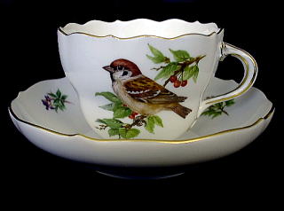 自然動物描いた高額シリーズ、カップとソーサーの縁に繊細な金彩が施されたシリーズです。裏にマイセン双剣マーク入り。 ご注文/お問合せ  |