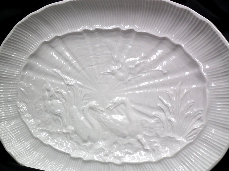 白鳥や鷺などの水辺の風景のレリーフが全体に刻まれてます大変優雅なディッシュ(約33x20.5cm)