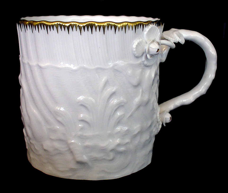 カップ高さ約7.5センチ、口径φ約7cm、容量約0.2L。白鳥や鷺などのレリーフが全体に刻まれてます。カップの口の部分は細かく波打った形で、ハンドルの付け根部分も写真右のように、優雅で凝ったつくりとなっております。