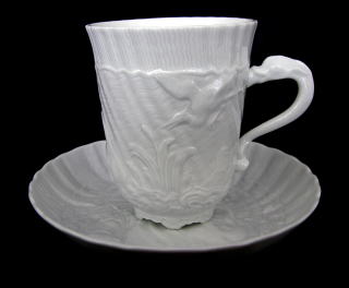 ドイツ高級磁器窯、マイセンの代表作のひとつです。オリジナルはハインリッヒ・フォン・ブリュール伯爵(1700~1763年)のためにつくられました。白磁に白鳥や鷺のレリーフが刻まれ、取手にはドルフィン、蓋のつまみは蝸牛の優雅なシリーズです。このスワンサービスは1737~41年にマイセンの造型の基礎を築いたヨハン・ヨアヒム・ケンドラーにより型が作られ、J.G.ヘロルトによって絵付けがなされました。マイセンを代表するこの2人によって完成された作品です。