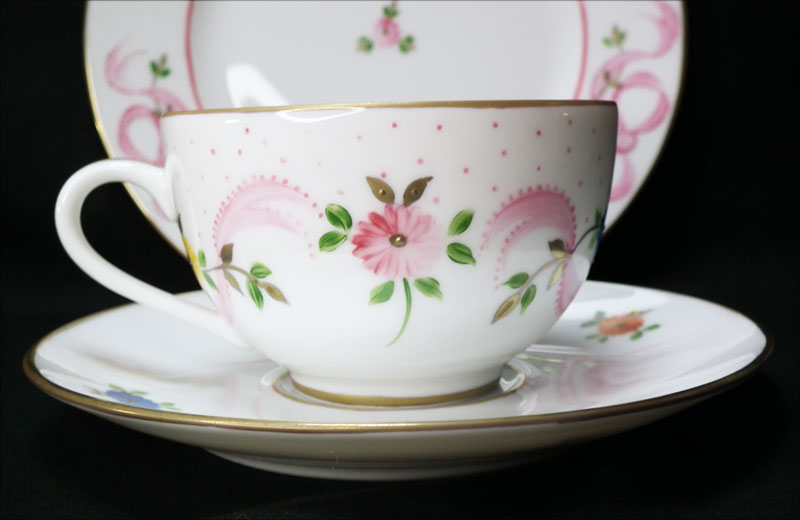 ピンクのリボンが可愛らしい、マリーアントワネットシリーズ、ピンクのラインがないシンプルな絵付けが発表されました。ハンドペイントですので、絵付けはひとつづつ違います。ゴールドは24金を使用。